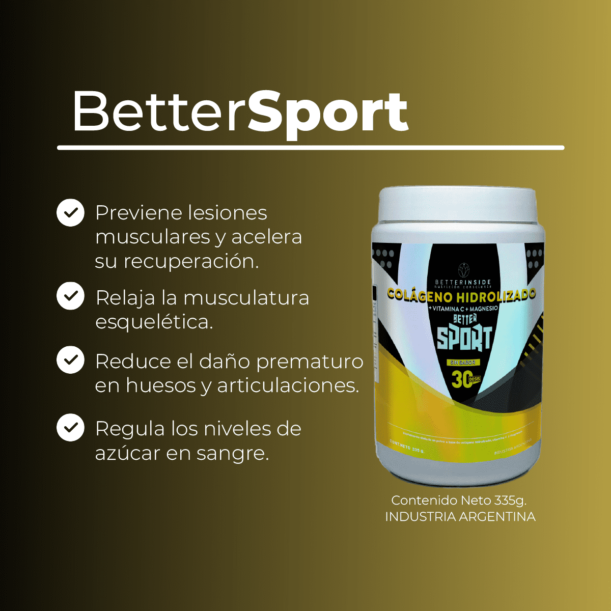 El Colágeno Hidrolizado Better Sport® es un complemento ideal para la suplementación diaria de quienes practican deportes, ya sea de intensidad baja, moderada o alta Fomenta la producción energética, previene las lesiones musculares y mejora el proceso de recuperación post entrenamiento Actúa sobre tendones y ligamentos, mejorando su resistencia, densidad y consistencia, lo cual se traduce en más fuerza y menos daños El Magnesio ayudar a la relajación muscular post entreno y a la eliminación de ácido láctico retenido en el musculo Está recomendado para prevenir el daño en músculos, articulaciones y tendones Al no tener sabor, puede ser agregado a cualquier preparación tanto fría como caliente, incluso puede mezclarse con otros suplementos de uso habitual