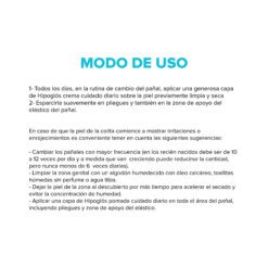 Todos los días, en la rutina de cambio del pañal, aplicar una generosa capa de Hipoglós pomada cuidado diario sobre la piel previamente limpia y seca, esparciéndola suavemente en pliegues y también en la zona de apoyo del elástico del pañal.