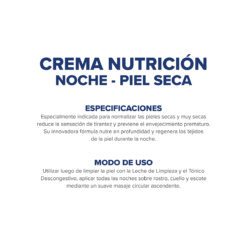 Nutre en profundidad, hidrata por 72 h. y repara los tejidos de colágeno y elastina. Alivia la sensación de tirantez. Previene el envejecimiento prematuro de la piel. Indicada para piel seca a muy seca.