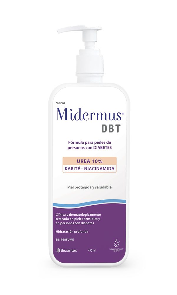 Midermus DBT, formulada para pieles de personas con diabetes. Con alta concentración de UREA (10%), estimula el proceso natural de recambio celular, mejora la resequedad y agrietamiento de la piel. La Niacinamida estimula la síntesis de ceramidas para mantener la barrera de la piel, retener la hidratación y prevenir la pérdida de agua transepidérmica. La manteca de Karite potencia los resultados con su poder regenerador y repilidizante. Elimina durezas restableciendo el aspecto saludable y equilibrado de la piel.