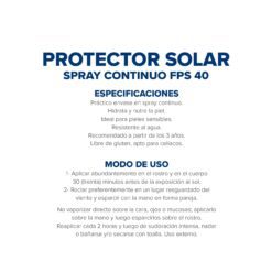 Práctico envase en spray continuo. Hidrata y nutre la piel. Ideal para pieles sensibles. Resistente al agua. Recomendado a partir de los 3 años.