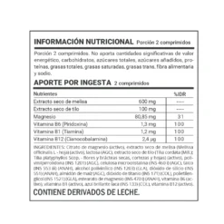 Aporte por ingesta (2 comprimidos): Extracto de melisa 600 mg, Extracto seco de tilo 100 mg, Magnesio 80.85 mg, Vitamina B6 (Piridoxina) 1.3 mg, Vitamina B1 (Tiamina) 1.2 mg, Vitamina B12 (Cianocobalamina) 2.4ug.