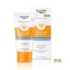 Eucerin Sun Face Oil Control FPS 50+ protege la piel grasa y con tendencia al acné de los daños inducidos por el sol con Advanced Spectral Technology y la defensa contra la luz HEVIS para una protección UV muy alta, ofreciendo un control de la grasa y el brillo durante 12 horas, además de pigmentos de color para un tono de piel uniforme y homogéneo.