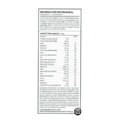 Suplemento dietaio dietetico en polvo a base de proteinas, hidroxi-metilbutriato, vitaminas y minerales, sabor vainilla. Libre de gluten.